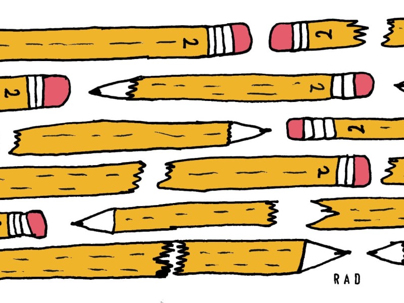 Illustration: Several No. 2 pencils are arranged into five rows, some of the pencils whole and some of them snapped into pieces. Illustration by Rachal Duggan.