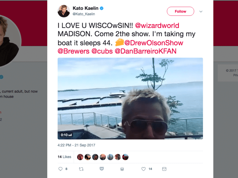 Given the last-minute shifting of guest star schedules at this weekend’s Wizard World comics convention at the Alliant Energy Center (nine major guest cancellations so far, which threw our coverage earlier this week all out of whack), you’d be forgiven for missing out on one notable recent addition: Kato Kaelin. That’s right, not only is the former resident of OJ’s guest house blessing Madison with his presence, but according to a batshit crazy twitter post, apparently he’s brought along his dubious-sounding boat that somehow “sleeps 44.” He followed that up with a Brewers-bashing tweet screed crazy enough to warrant its own post over at Deadspin.