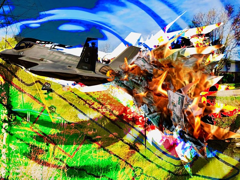 Illustration: Digital collage of an F-35 jet flying over Starkweather Creek. Money is burning in the jet fuel stream and waves of bright toxic green emanate from the F-35. Illustration by M.Rose Sweetnam.