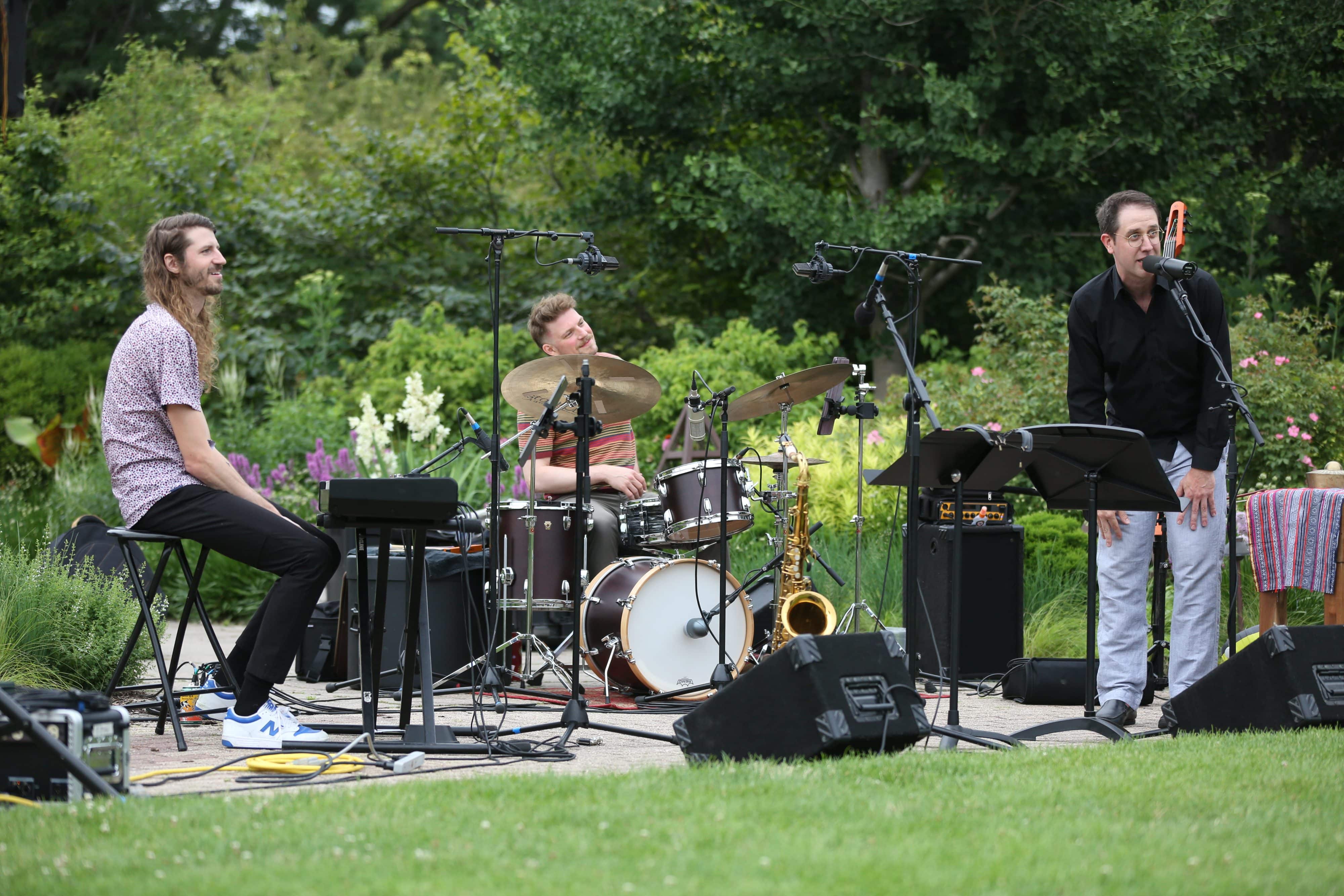 Mr. Chair play at Olbrich Botanical Gardens. Plenty of greenery is visible, as are the band's three members, who are, from left to right: seated at an electric keyboard, a drumkit, and standing in front of an upright bass. The garden that surrounds them is in bloom.